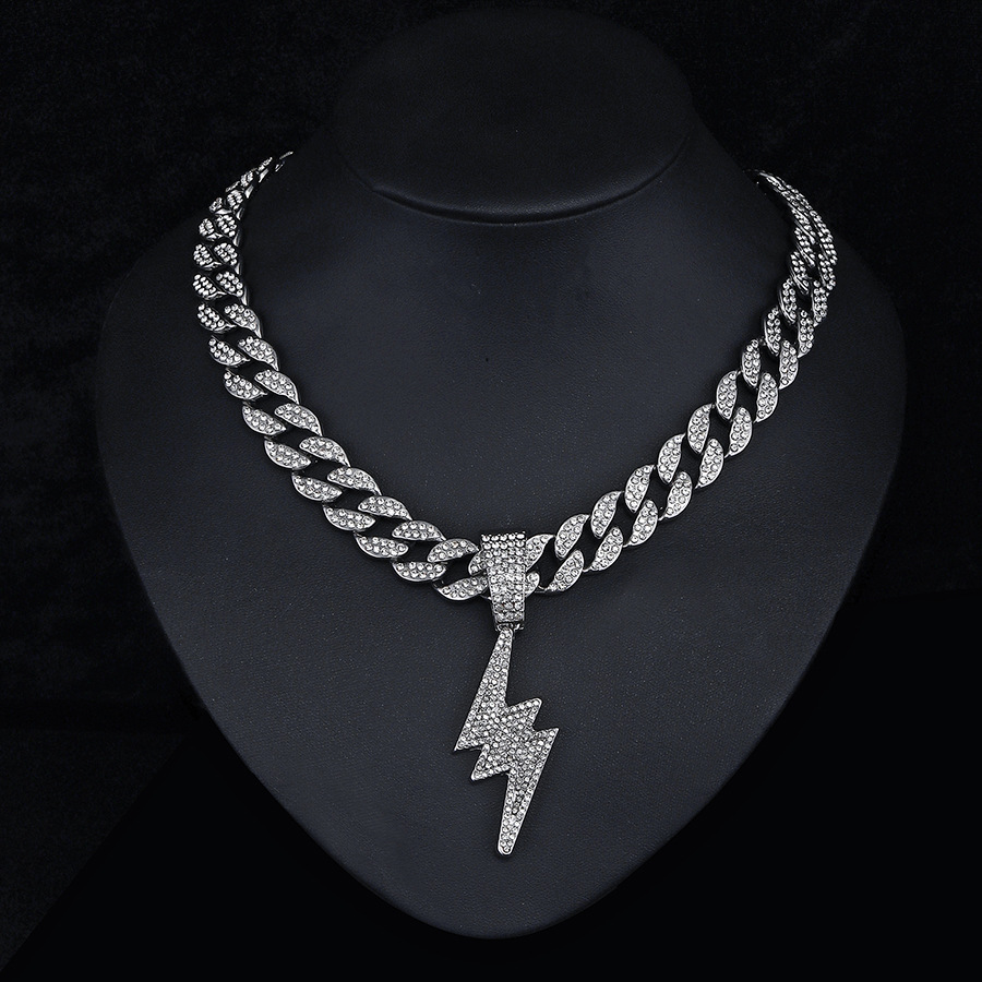 European and American Cross-border Trendy Men Cool Diamond Lightning Pendant Necklace Hip-hop Street Dance Rap Wear Cuban Chain Necklace