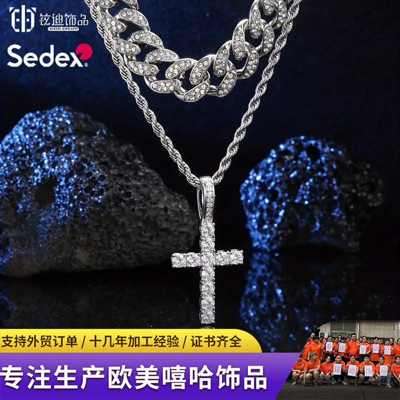 Cross-border Full Diamond Cross Necklace Men's Fashion Brand Street Cuban Chain European and American Rap Hip Hop Men's and Women's Alloy Necklace
