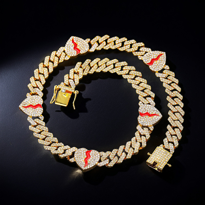 Cross-Border European and American Heart Full Diamond Amazon Men's and Women's Alloy Necklace Trendyy Cool Hip-Hop Rap Style Cuban Chain