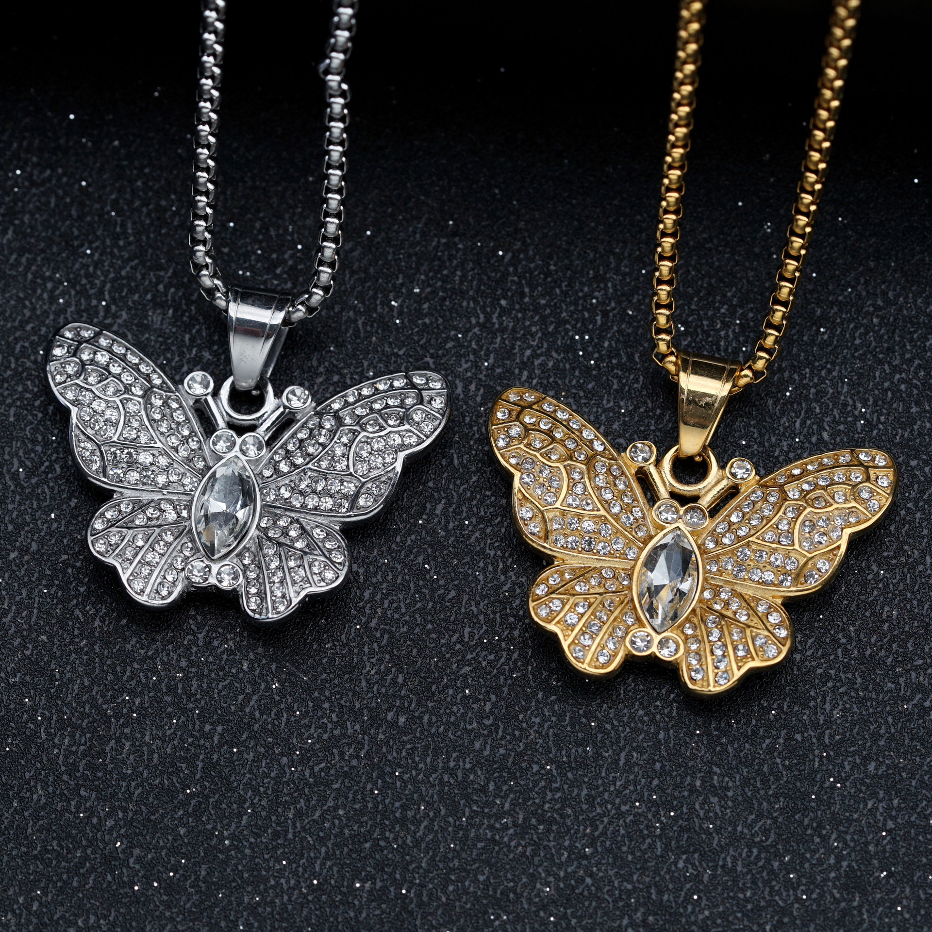 European and American HIPHOP hip hop rap new stainless steel full diamond butterfly pendant butterfly necklace DW556