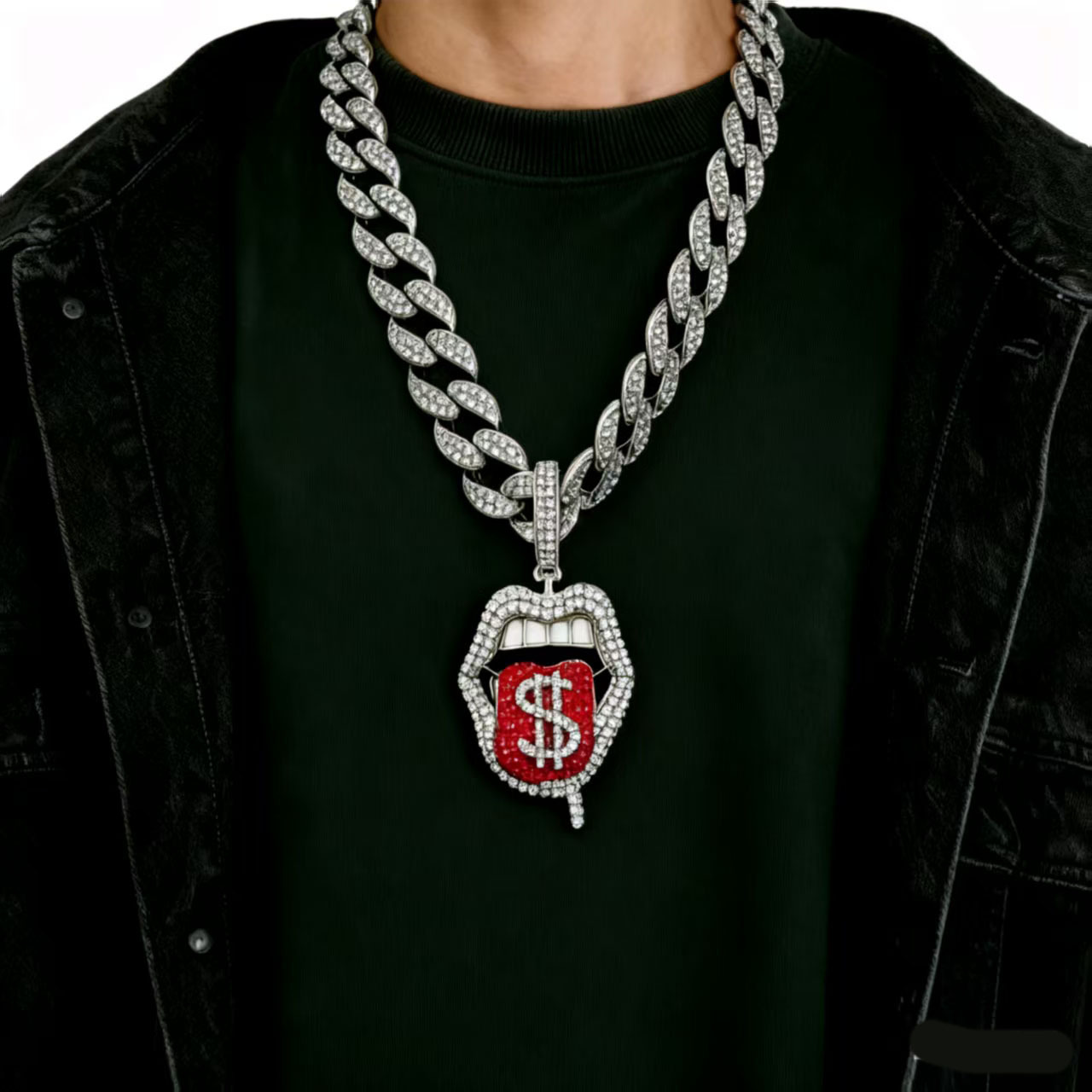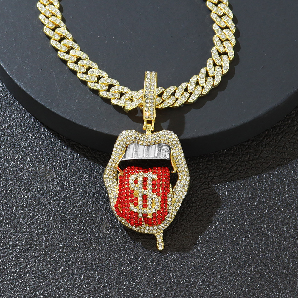 Hip-Hop Personality Three-Dimensional Rap Alloy Full Diamond Tongue Pendant Necklace Cross-Border European and American Hip-Hop Trendy Accessories