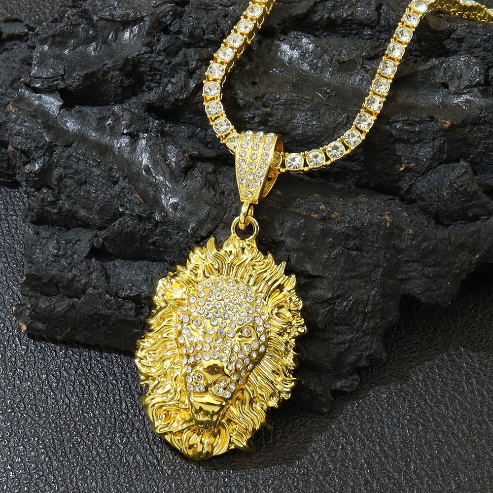 Diamond-encrusted three-dimensional lion head pendant single-row diamond tennis chain necklace hip-hop rapper disco clavicle chain neck chain