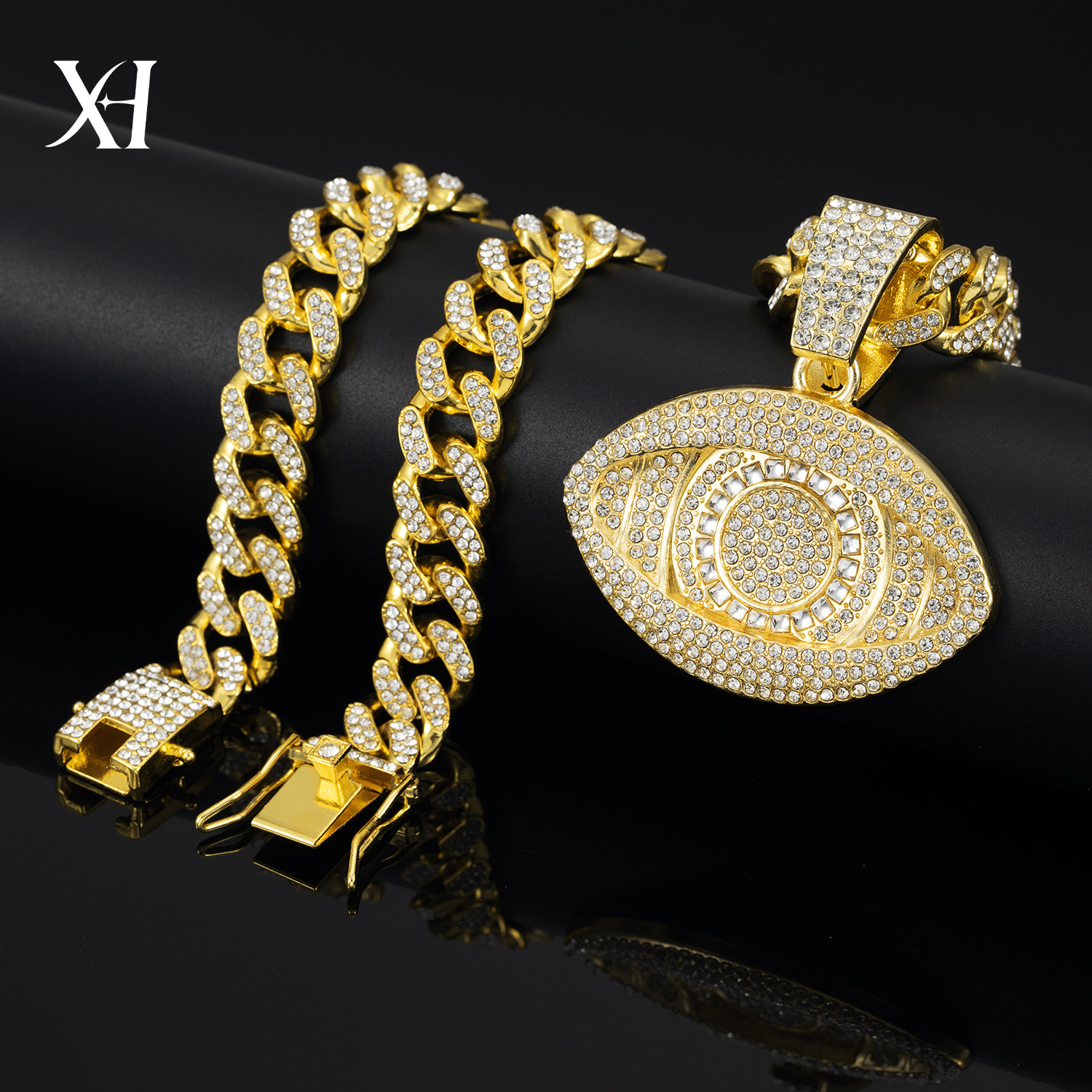 Hot sale American style big eyes necklace alloy encrusted hip hop hip hop rap jewelry cuban chain production factory