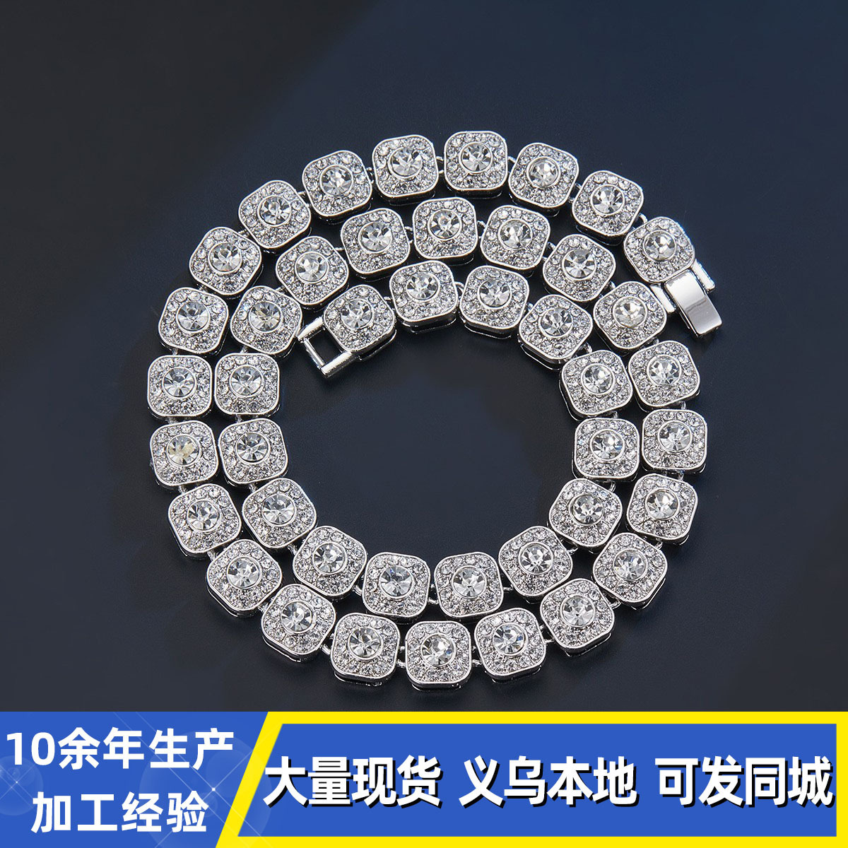 European and American Square Diamond Rock Candy Heart 10mm Rectangular Single Row Chain Necklace Hip-Hop Rap Tennischain Chi Cheng Same Style