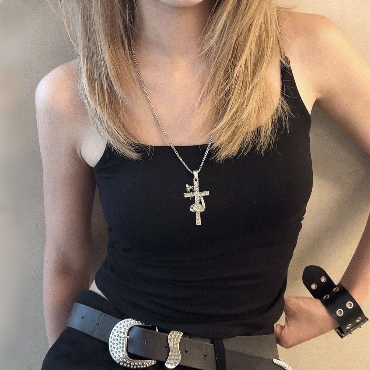 Vintage Snake Wrapped Cross Ins Retro European and American Rap Hip-Hop Men's and Women's Clavicle Chain Personalized Titanium Steel Chain