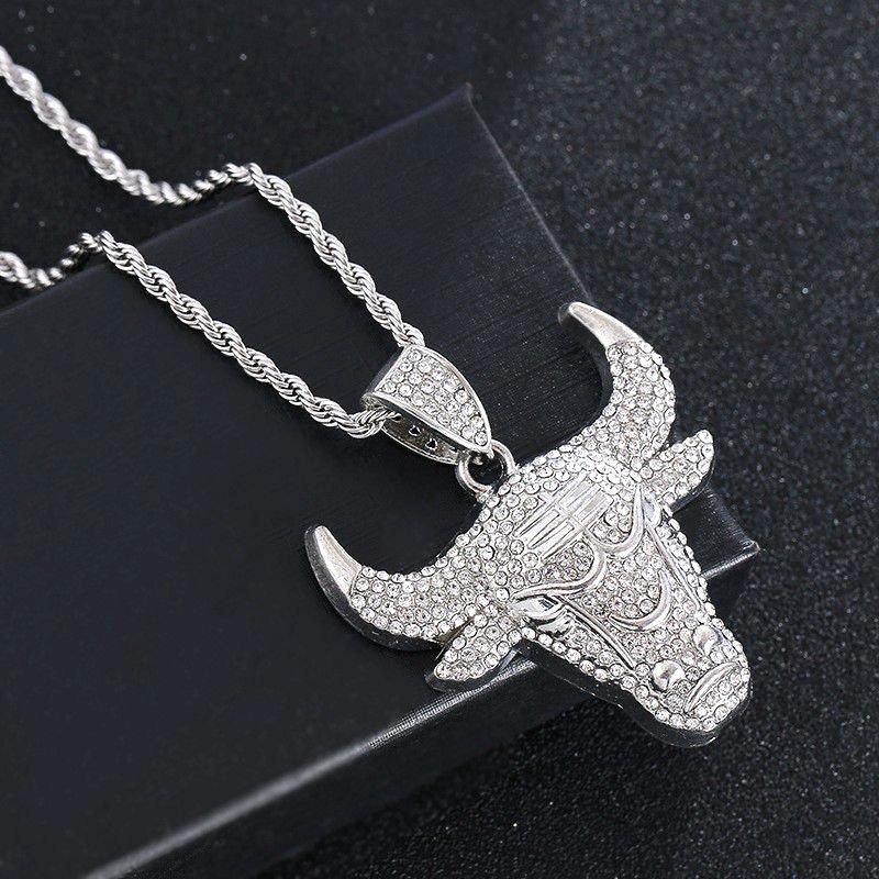 Hip-hop niche personality animal cow head pendant street rap style diamond three-dimensional creative domineering zodiac cow head chain