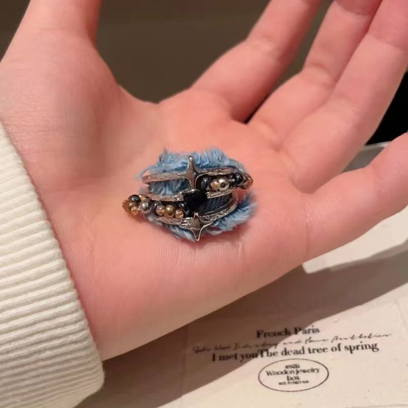 2024 New Four Mans Star Denim Beaded Open Ring Women's Vintage American Style Trendy Cool Hot Girl Personalized Ring