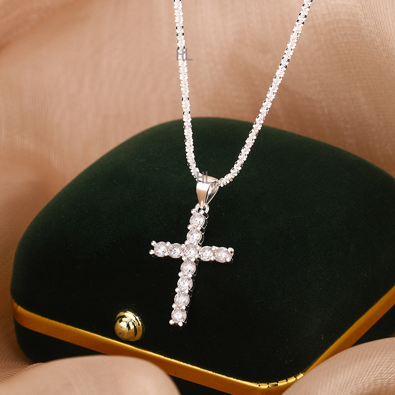 Full Diamond Cross Necklace for Men and Women Clavicle Chain Ins Glass Pearl Titanium Steel Chain High Street Rap Street Sweater Chain
