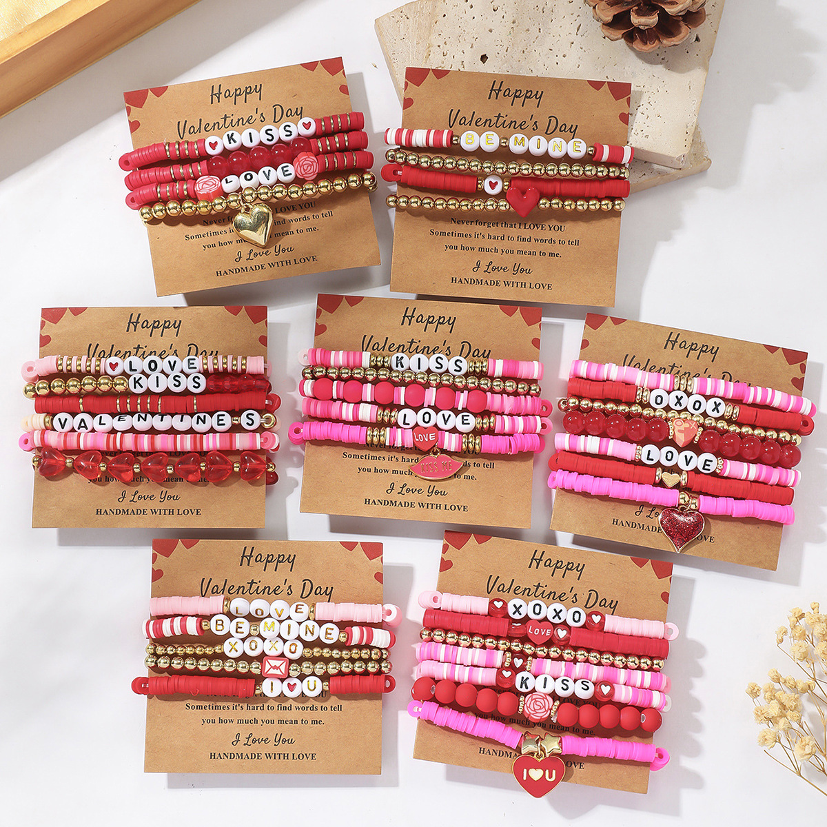 European and American Cross-Border Valentine's Day Love Bracelet Multi-Layer Couple Pink Heart Envelope Soft Clay Beaded Elastic Bracelet