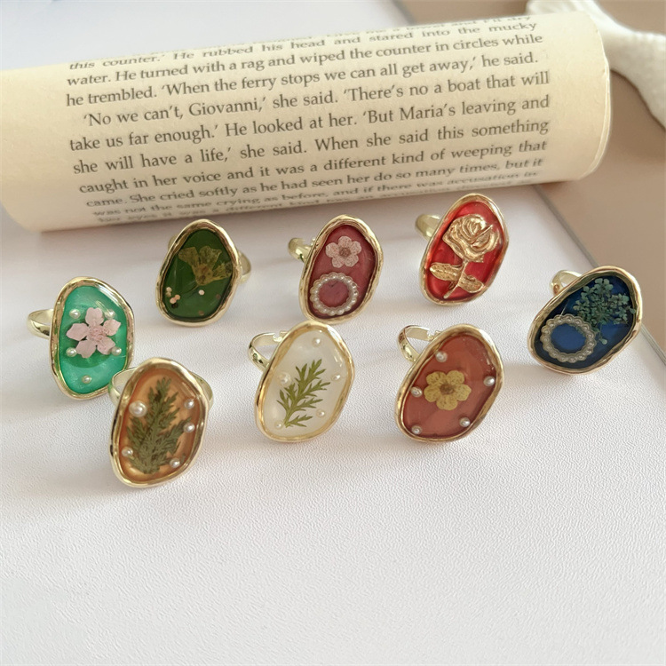 Spring and summer new pearl oval quicksand glue rose green leaf pink dried flower alloy color retention open ring women ~
