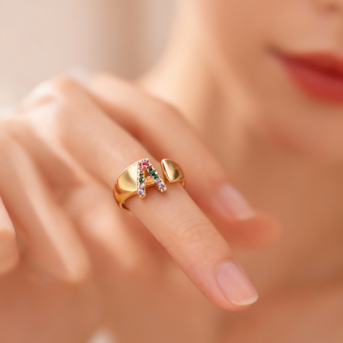 AliExpress fashion micro inlaid color zircon 26 English letters opening adjustable ring personality retro ring