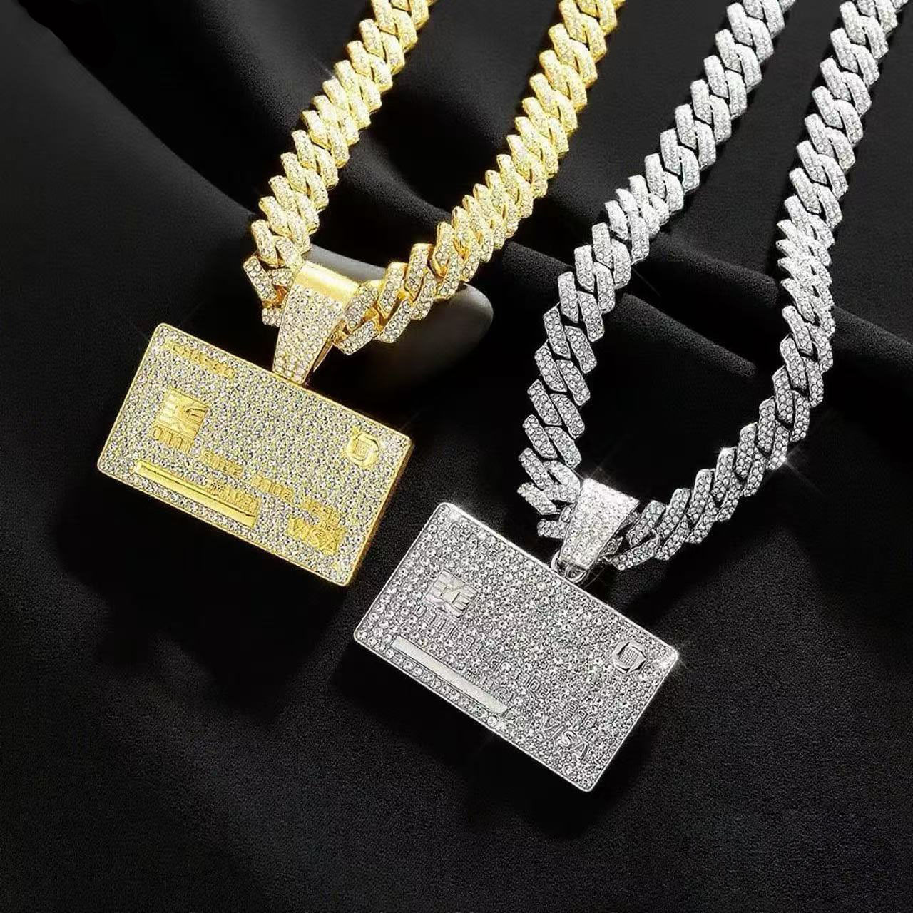 Full Diamond Bank Card Hip-Hop Necklace Creative Design Rap Male Nightclub Rapper Alloy Rhinestone Cuban Chain Pendant