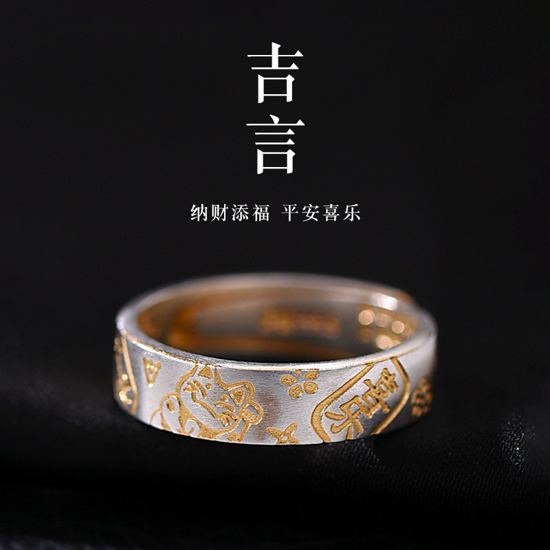 Gold-Painted Auspicious Words Ring for Men and Women, Fashionable National Style Heart Sutra Index Finger Ring with Engraving 2024 New Hot Style Wholesale