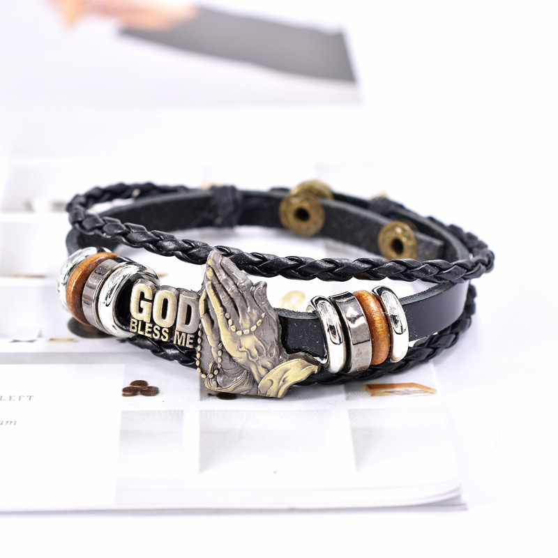 Retro Prayer Hand Retro Electroplated Woven Bracelet Adjustable Zinc Alloy Letters God Bless Button Cowhide Bracelet