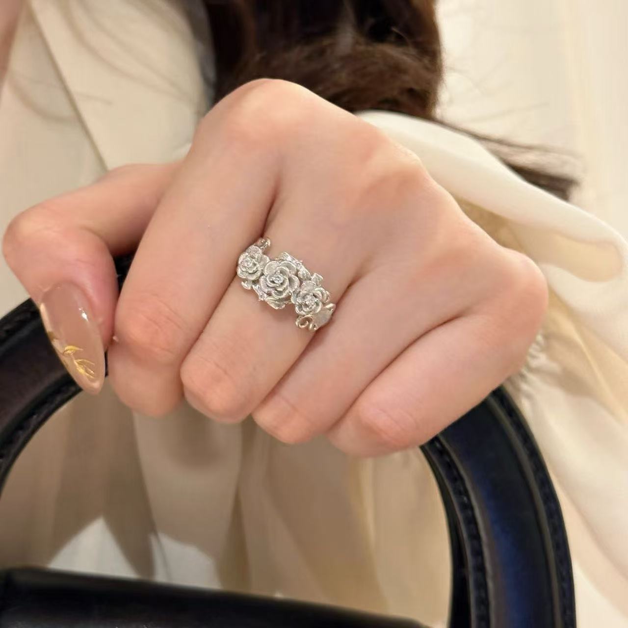 Vintage Silver Brushed Rose Flower Ring Retro Fashion Personality Temperament Ring Trendy Versatile Jewelry