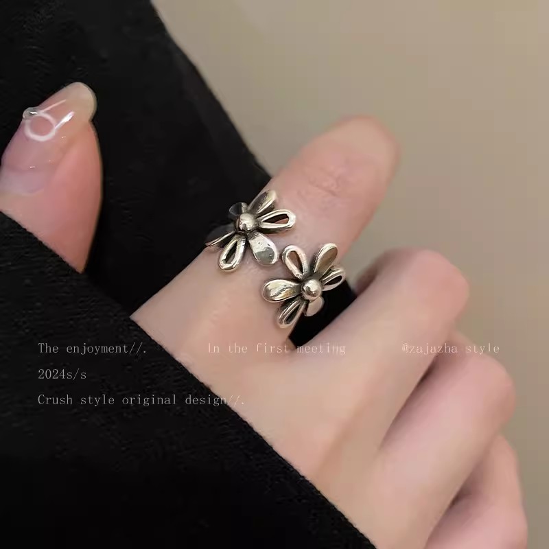 Vintage Old Small Flower Opening Adjustable Ring Women's Ins Cold Style Finger Ring Niche Design Ring for Men