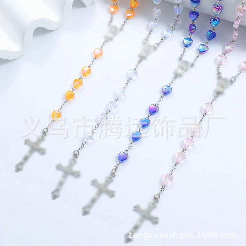 Cross-border retro transparent AB colorful transparent heart beads cross necklace alloy tag all-match sweater chain