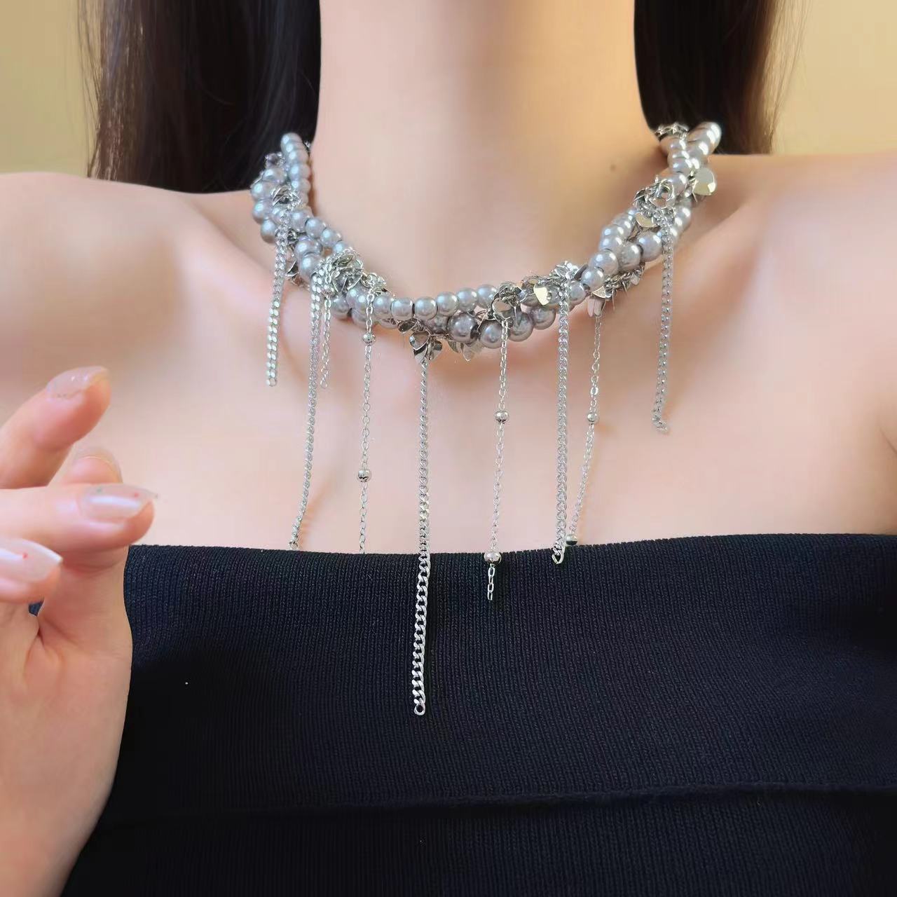 Dark Wind Diamond Winding Multi-layer Tassel Necklace Chain Winding Beaded Clavicle Chain Punk Autumn Winter Choker Necklace Chain