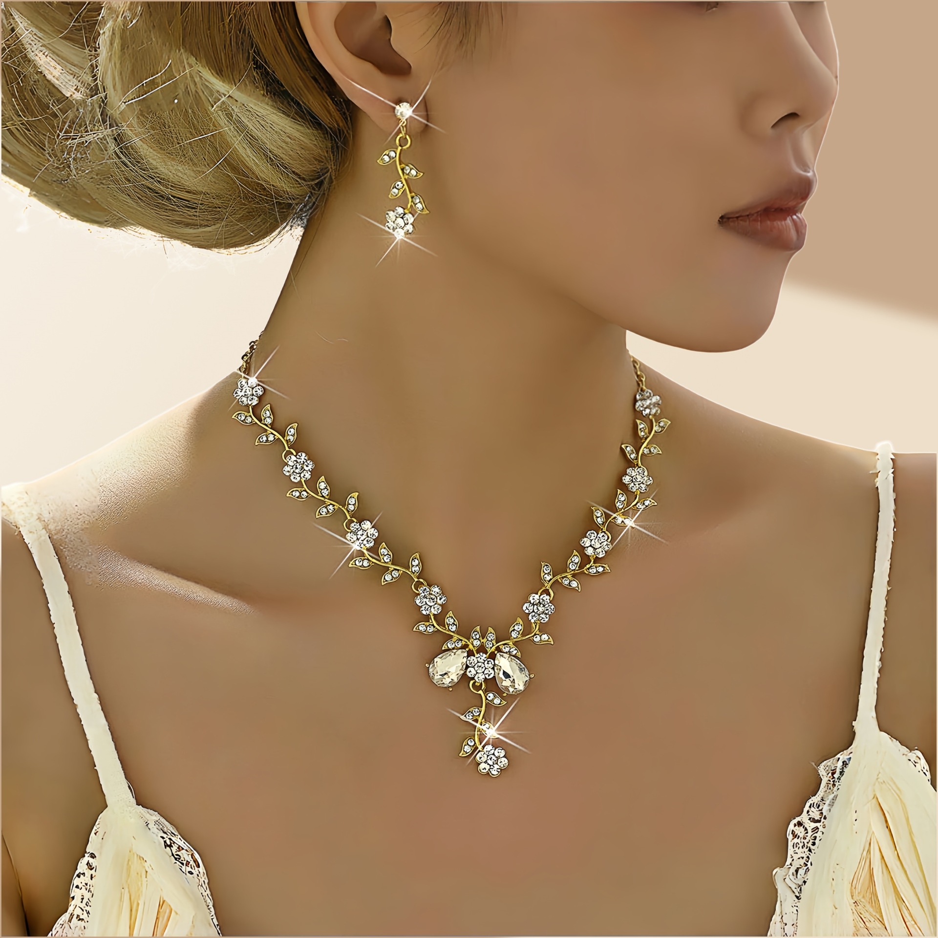 Cross-Border High-End Fashion Elegant Flower Alloy Rhinestone Bridal Necklace Earrings Set Women's Party Dress Accessories