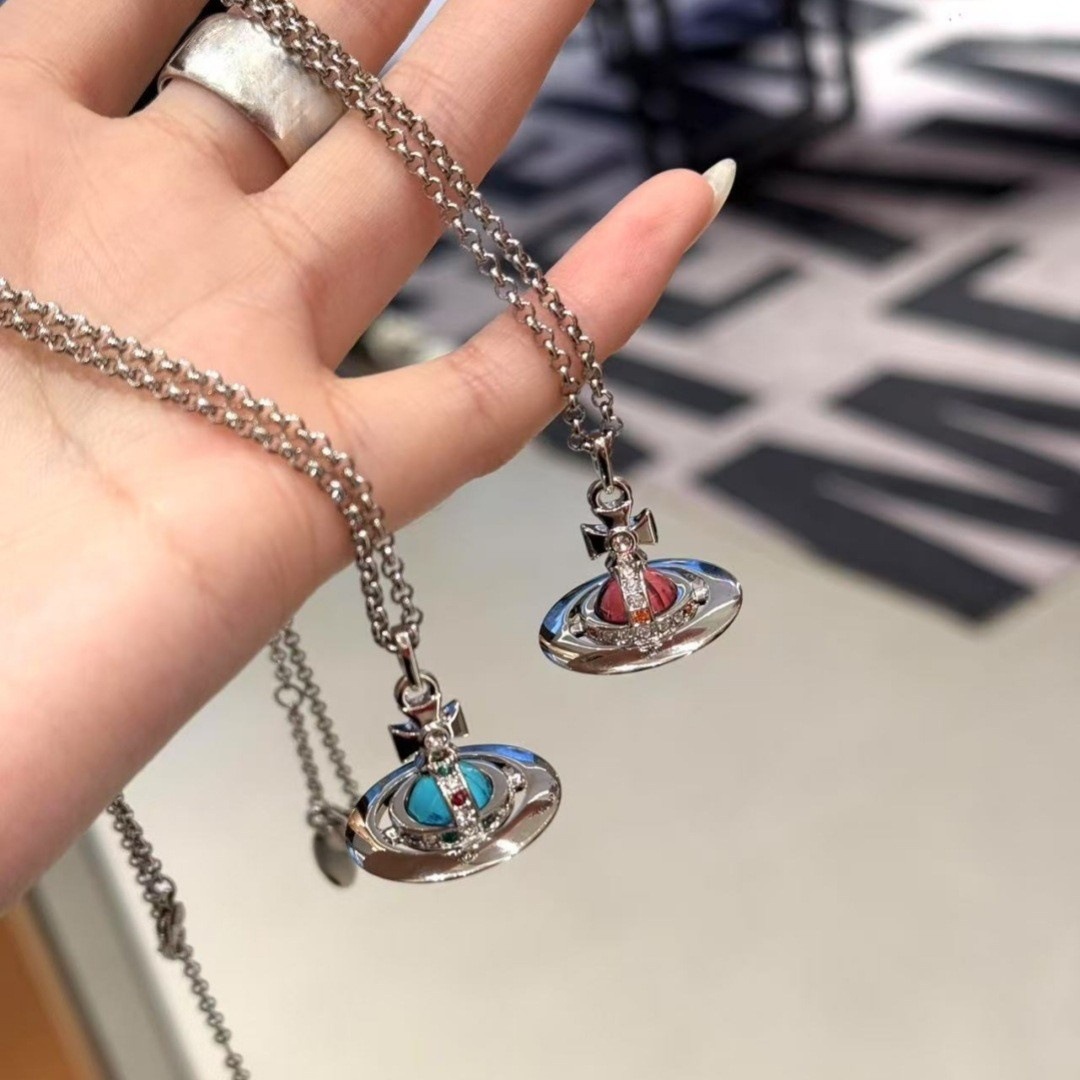 [New Style] Empress of the West Crushed Ice Blue Watermelon Red Orb Necklace Women's Small Medium Planet Pendant Saturn Clavicle Chain