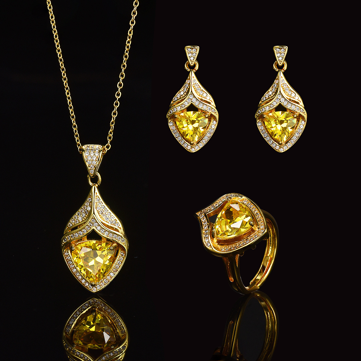 Cross-Border Hot-Selling European and American Style Retro Full Diamond Fat Triangle Goose Yellow Zircon Pendant Necklace Color Treasure Ring Earrings Set