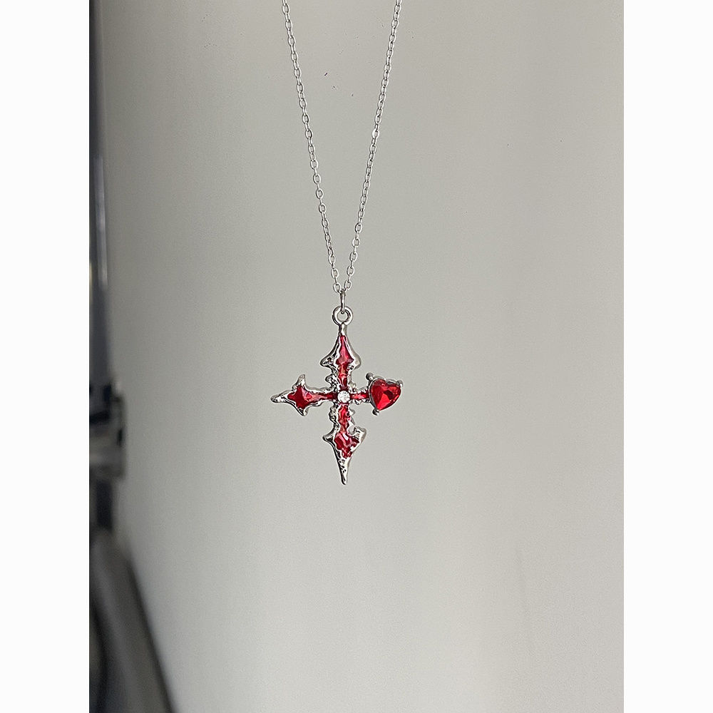 Vintage Red Rhinestone Cross Pendant Necklace with Unique Design and Stylish Clavicle Chain Jewelry