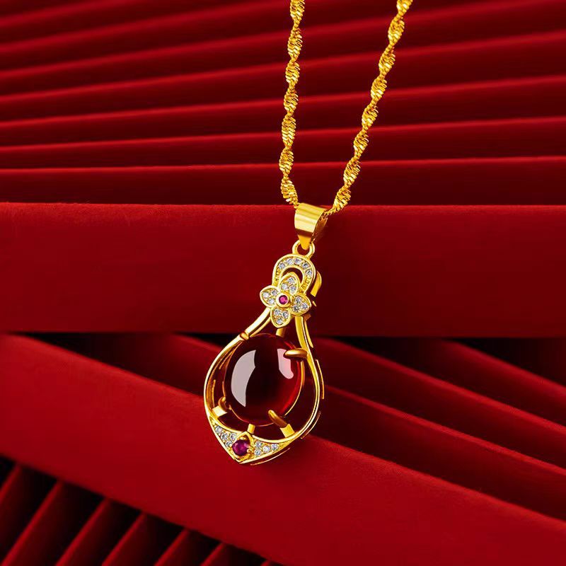 New Shiny Large Zircon Ruby Pendant Titanium Steel Necklace Women's Fashion Retro Style Light Luxury Hot Style Clavicle Chain