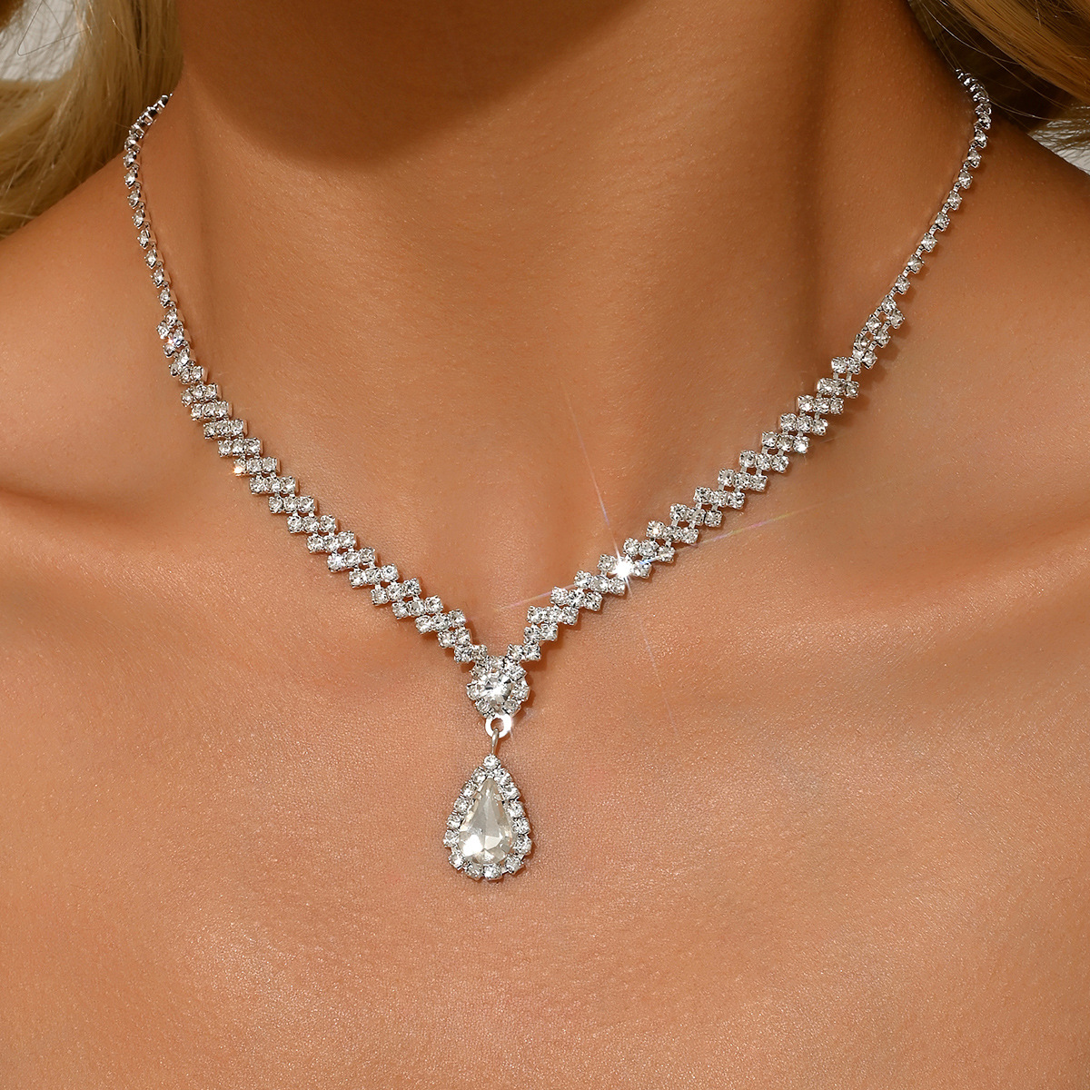 Supply wholesale rhinestone bride jewelry necklace Europe and the United States popular horse eye shape small chain wedding accessories
