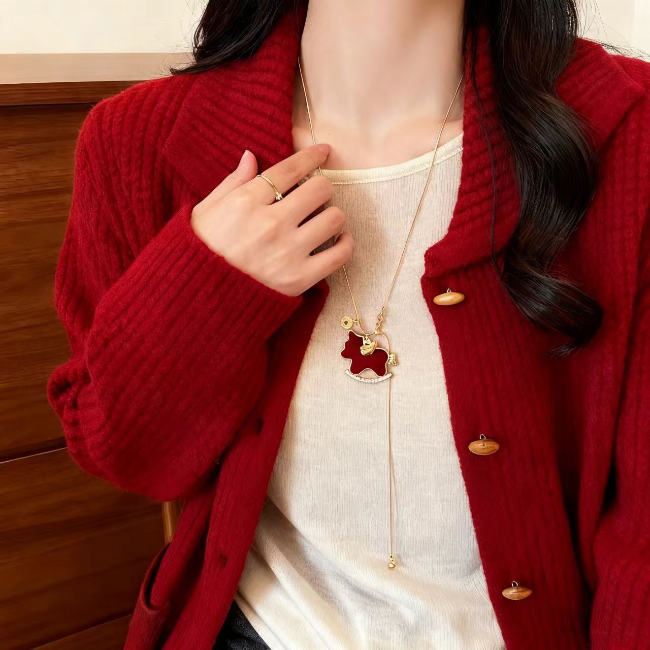 Good Luck Immediately! Burgundy Velvet Pony Necklace, Zodiac Year High-End Sweater Chain, Niche Design Accessories