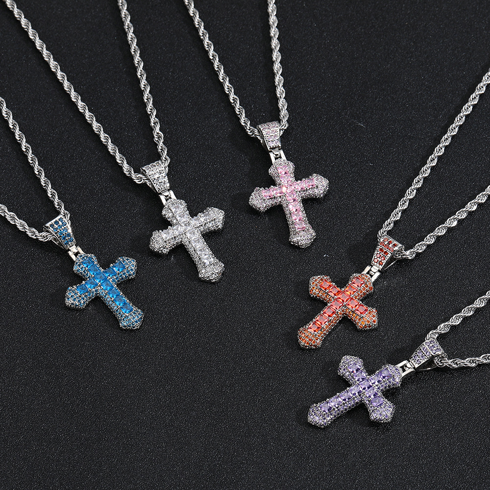 European and American-style Colorful Zirconium Cross Necklace Men's Hip-hop Full Diamond Zircon Pendant Cross-border Necklace Jewelry Women's All-match