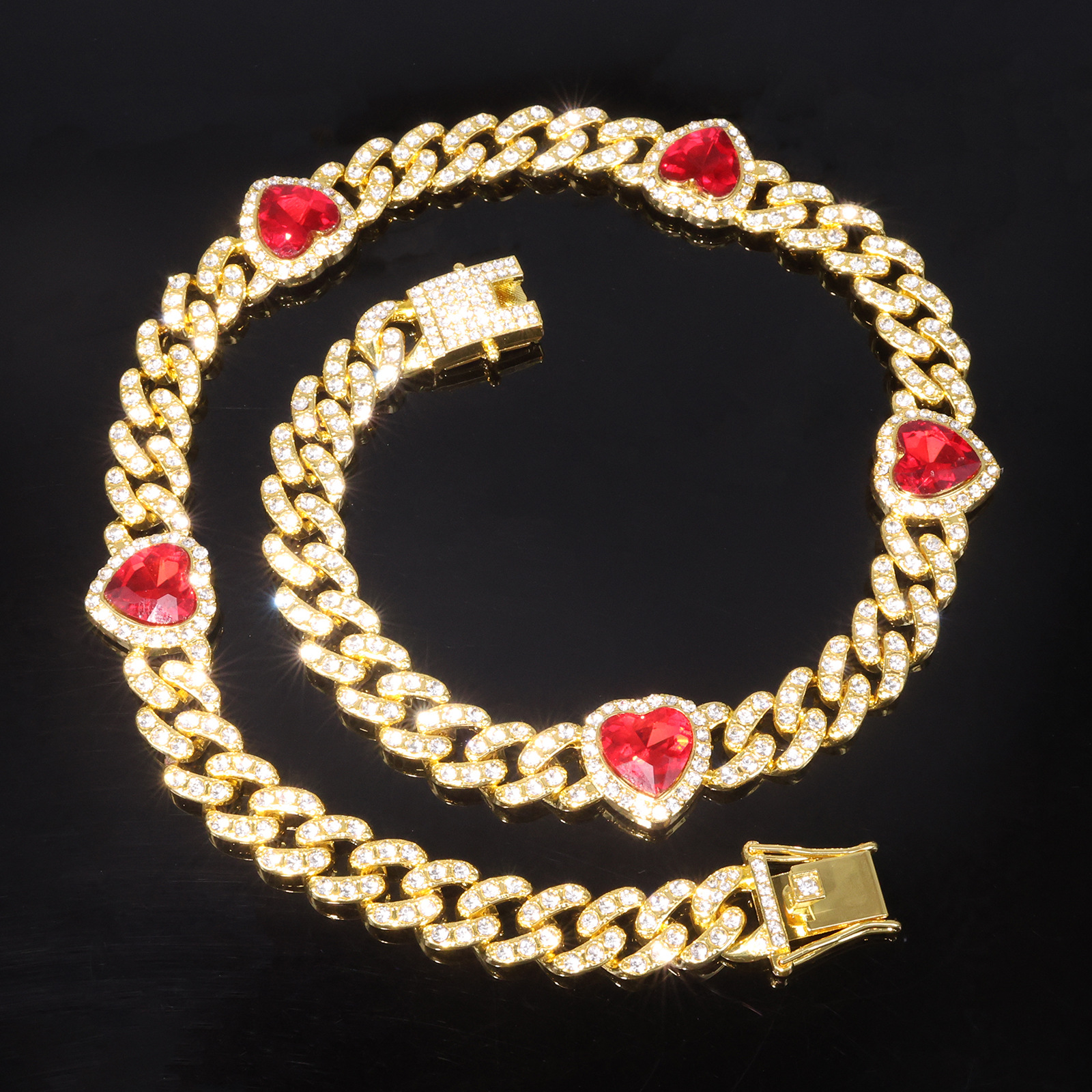 New European and American 12mm Three Diamond Red Heart Full Diamond Necklace European and American Cross-border Street Hip Hop Cuban Chain Jewelry