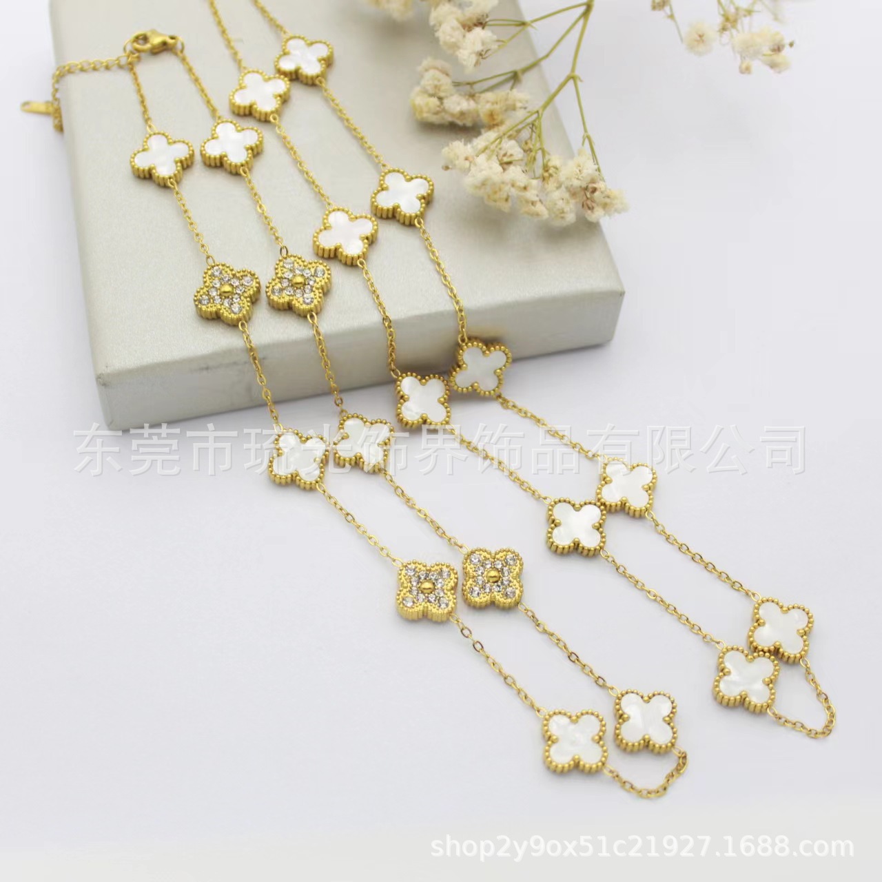 Amazon Cross-Border Popular Double-Sided Full Diamond Light Luxury Titanium Steel Four-Leaf Clover Necklace Non-Fading Women's Light Luxury Necklace Wholesale