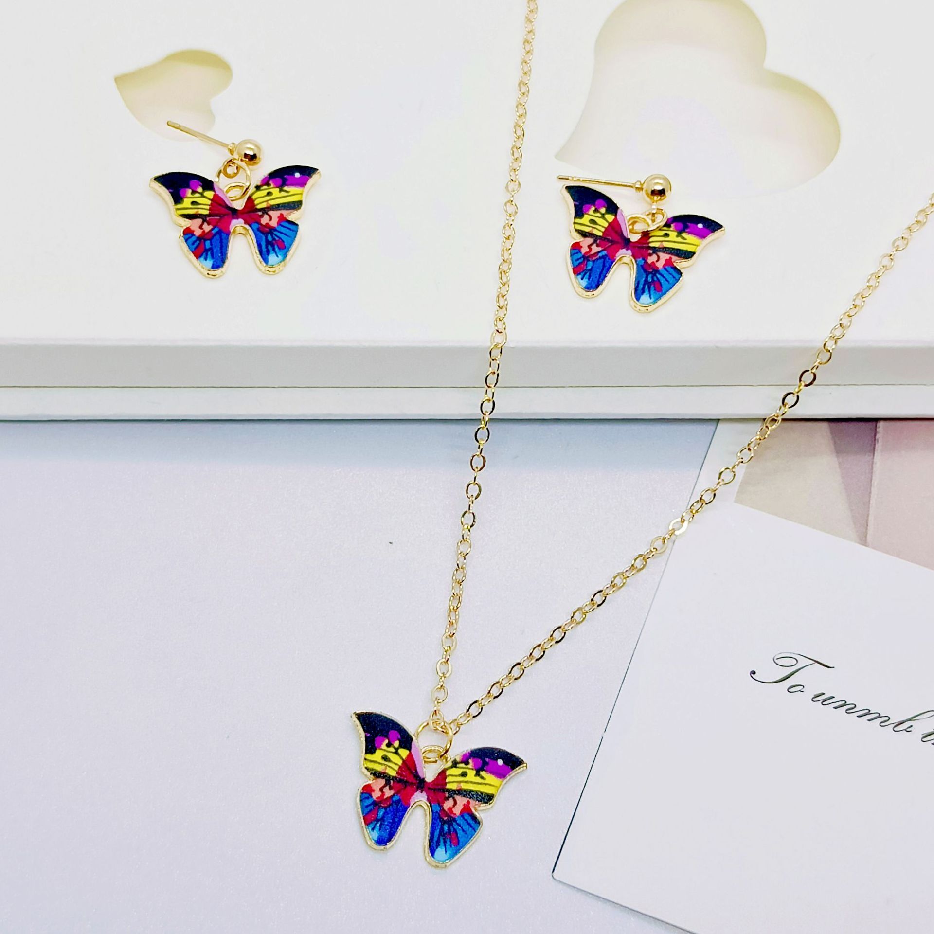 European and American Cross-Border Hot-Selling Bohemian Colorful Butterfly Earrings Necklace 3-Piece Set Ins Style Clavicle Chain Manufacturer Wholesale