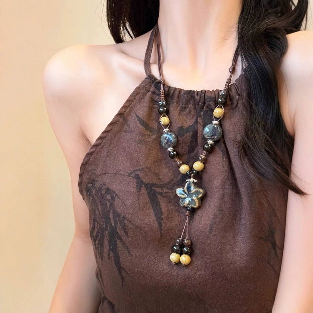 New Chinese Style Retro Ceramic Flower Beaded Necklace Women's Ethnic Style Long Tassel Woolen Chain High-end Accessories
