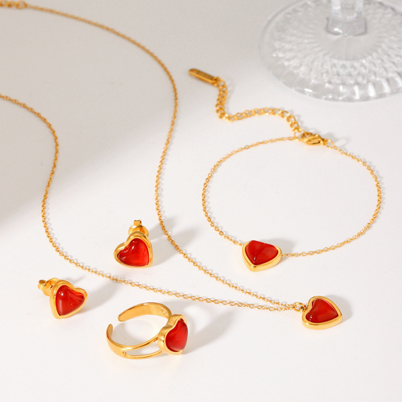 European and American Cross-Border Accessible Luxury Red Agate Jewelry Set High-End Heart Pendant Necklace Non-Fading Titanium Steel Earrings for Women