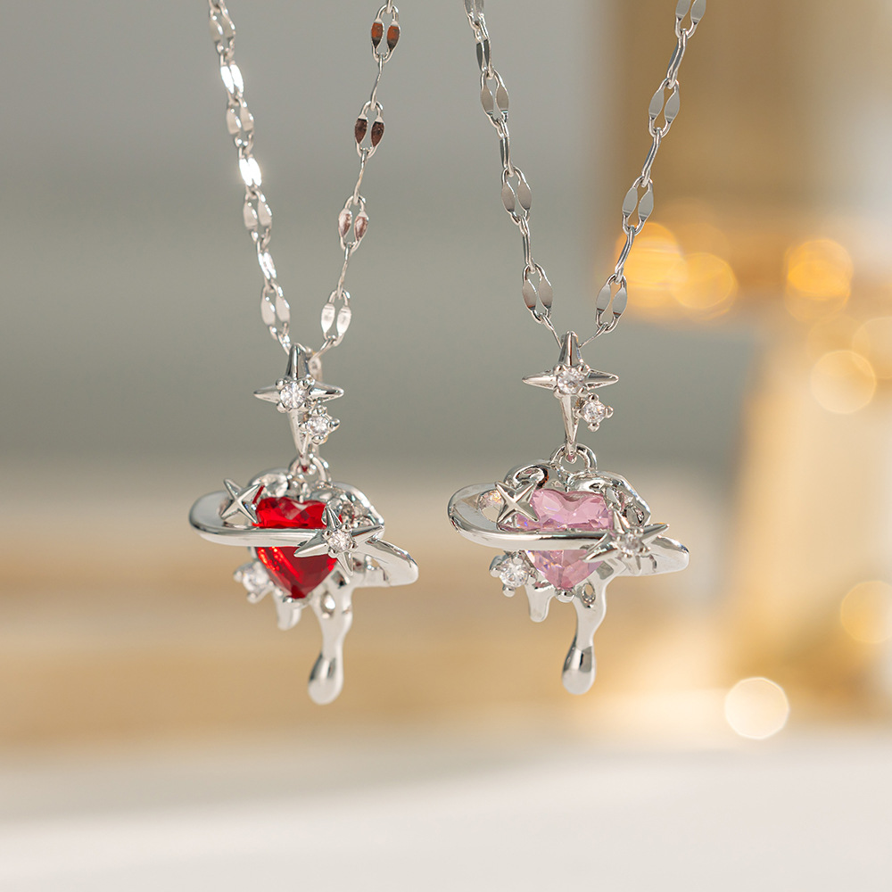 Pink Diamond Heart Necklace Ins Student Accessible Luxury Castle Sweet Pink Girl Heart Planet Guardian Sweetheart Necklace