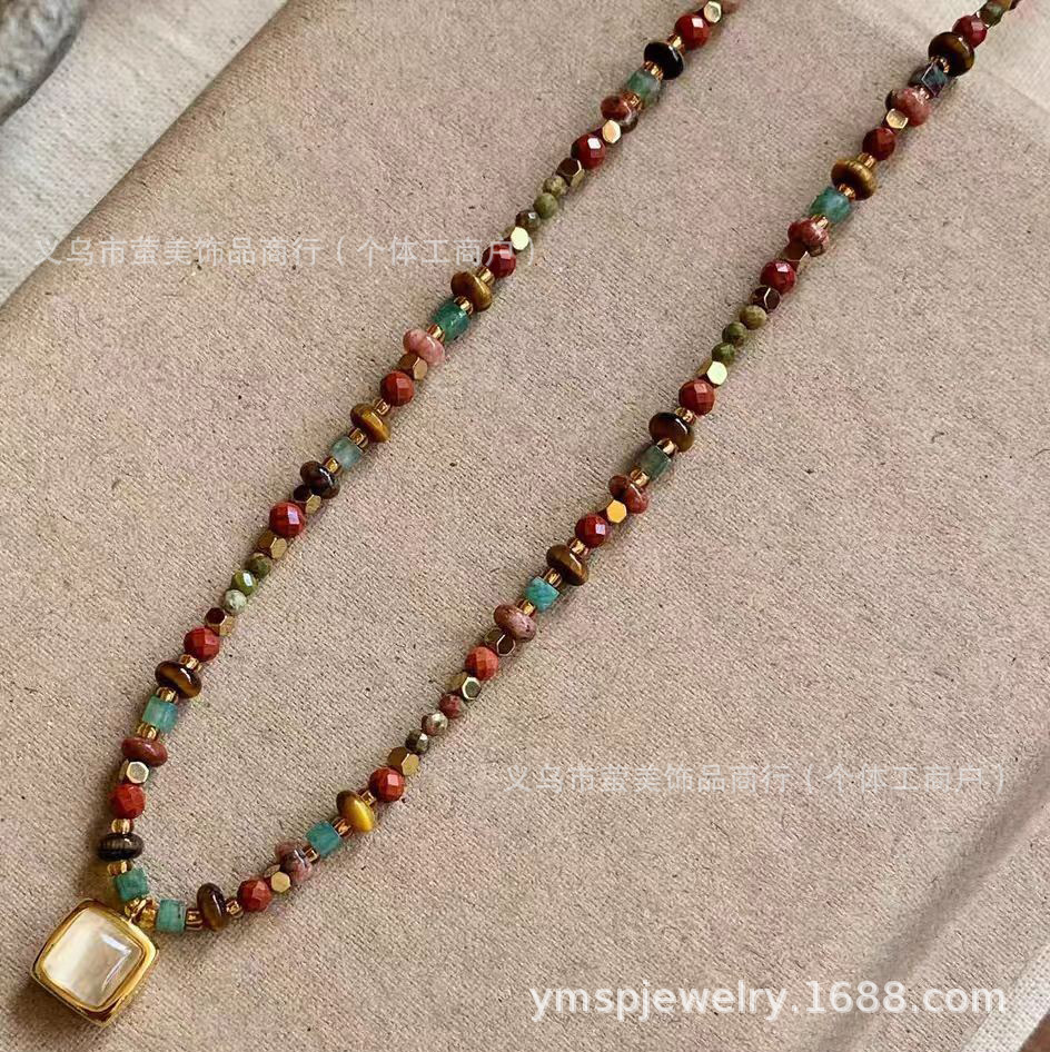 Ancora Red Vintage Style Cat's Eye Stone Square Pendant Natural Stone Titanium Steel Gold-Plated Color-Preserving Handmade Necklace