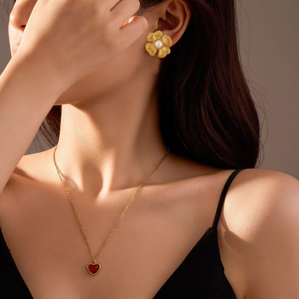 Love Necklace 18K Gold Fadeless Red Agate Peach Heart Titanium Steel Necklace Niche Ins Elegant Clavicle Chain Jewelry
