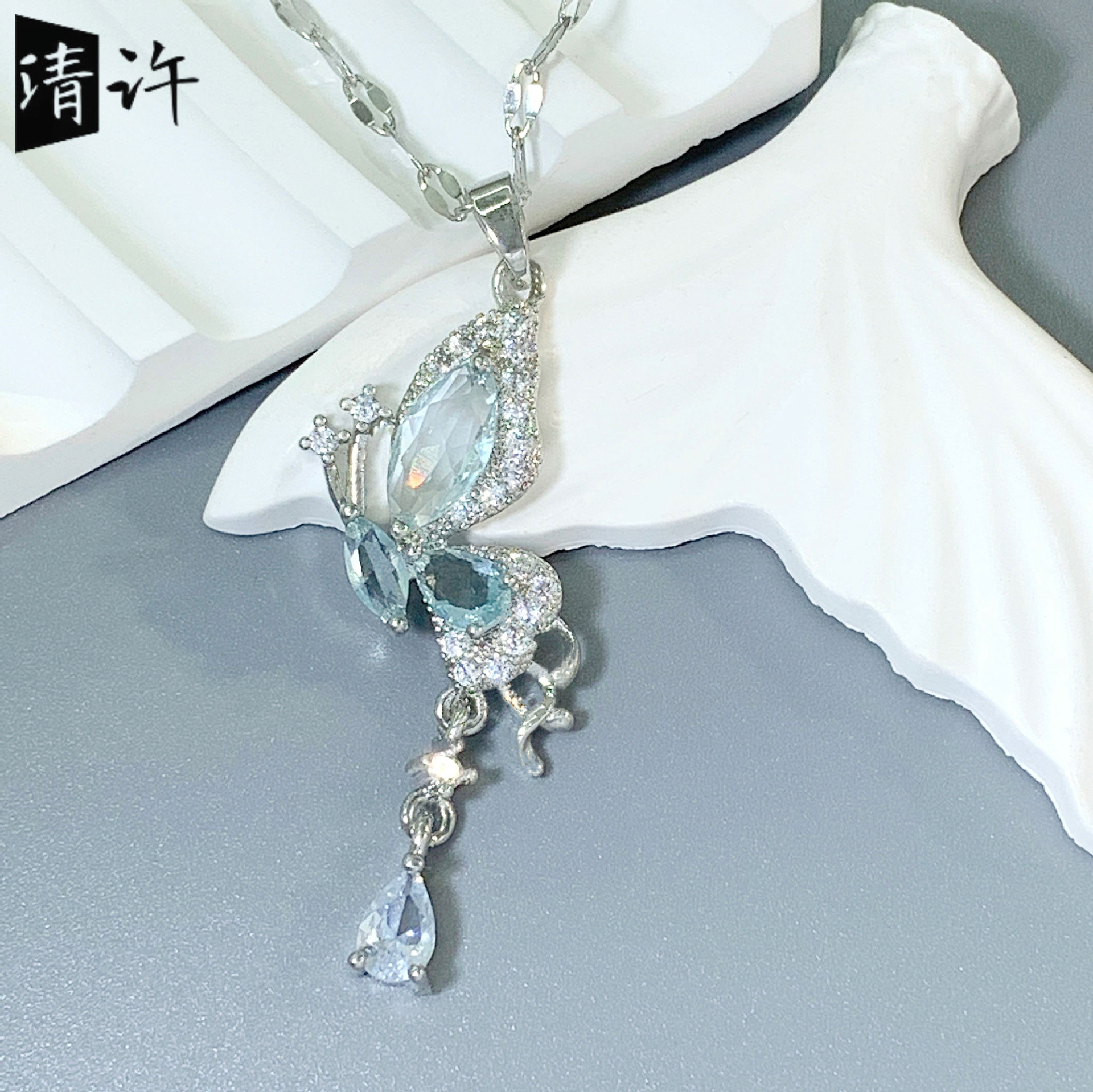 Ice Blue Tassel Butterfly Necklace Women's Accessible Luxury Niche High-End Simple Versatile Exquisite Copper Pendant Non-Fading Clavicle Chain