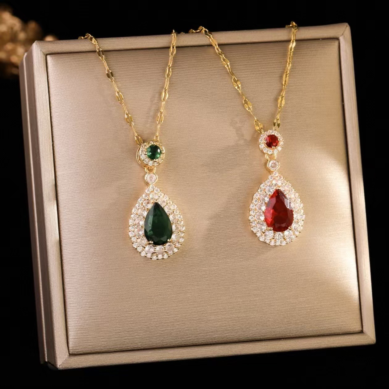 Cross-Border European and American Emerald Red Zircon Water Drop Pendant Necklace for Women, Fashionable, Elegant, High-End Titanium Steel Clavicle Chain
