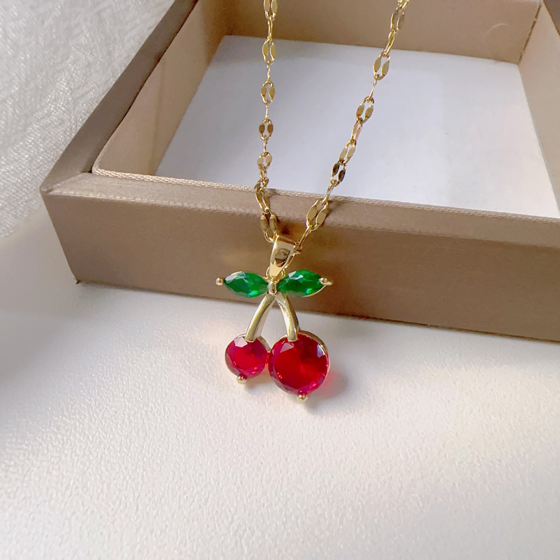 Titanium Steel Necklace for Women, Korean and Japanese Style, Popular on Xiaohongshu, Red Zircon Cherry Niche Design, New Trendy Collarbone Chain