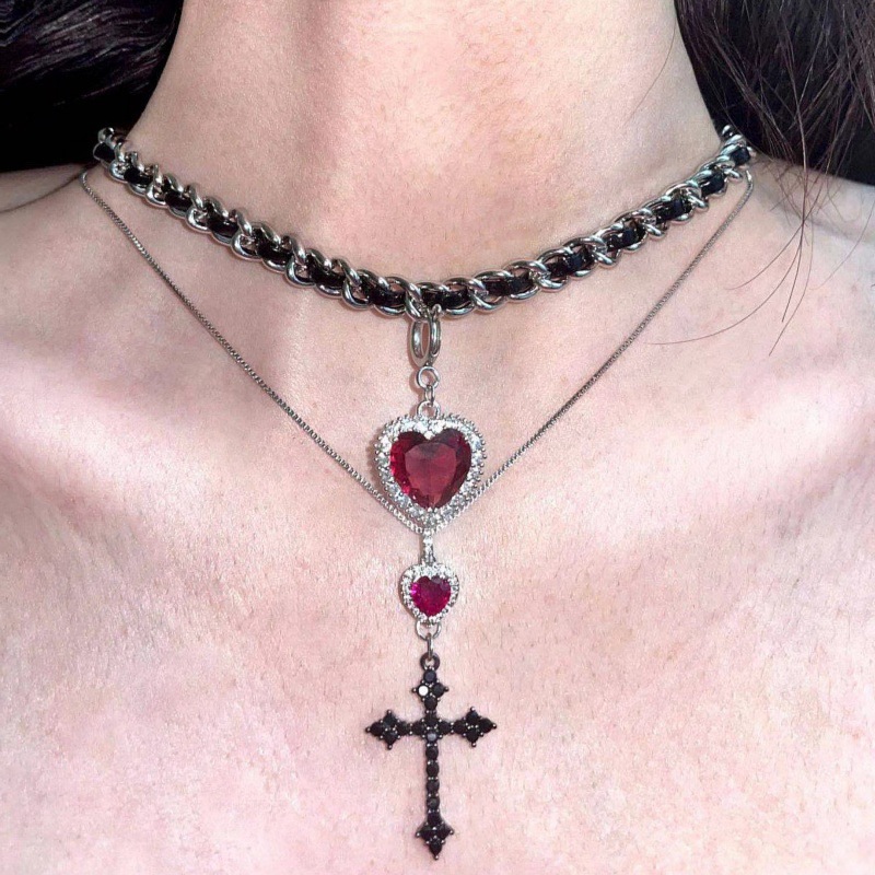 Sweet Cool Fashion Diamond-encrusted Red Love Cross Pendant Necklace Women's Light Luxury Vintage Niche Design Sense Collarbone Chain