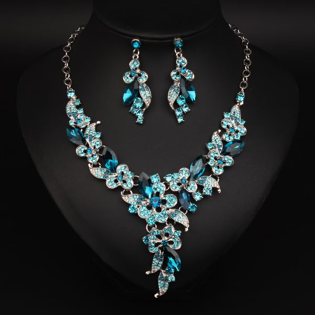 Amazon Cross-Border European and American Jewelry Artificial Crystal Necklace and Earrings Set for Women, Bridal Dress, Banquet Accessories