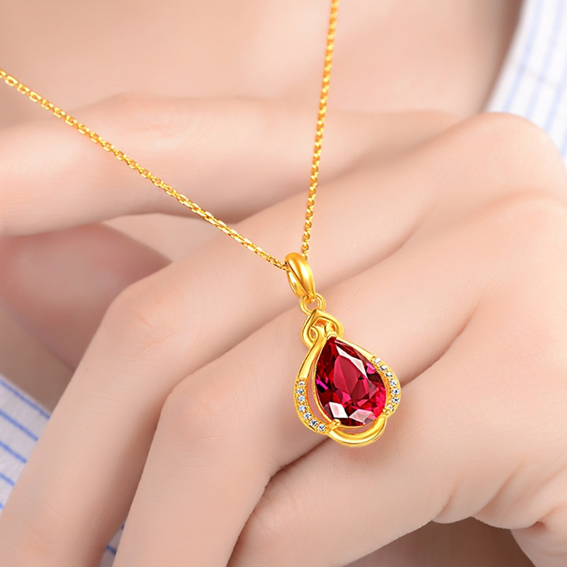 Copper-Plated Real Gold Pendant Micro-Encrusted Red Crystal Water Drop Necklace Light Luxury High-End Simple Versatile Accessory Cross-Border Hot Style