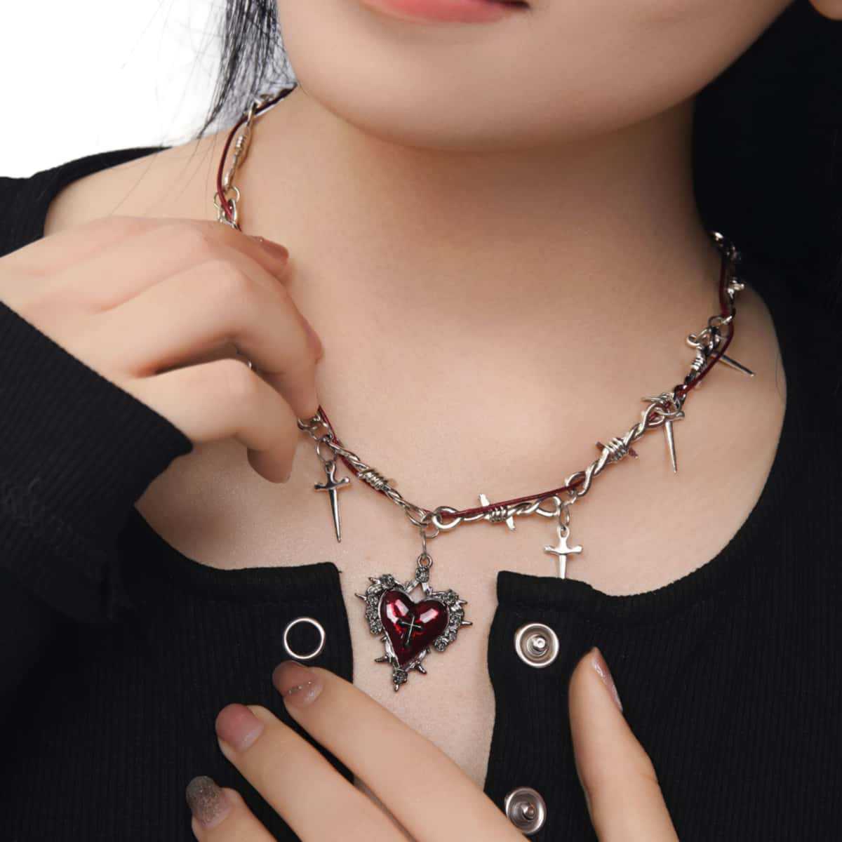 Amazon Cross-Border Export Gothic Y2K Subculture Red Heart Thorn Pendant Necklace Bow Cross