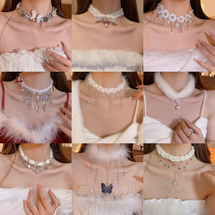 Feather bow pearl necklace autumn and winter sweet high sense clavicle chain super fairy fashion Chinese New Year jewelry wholesale women