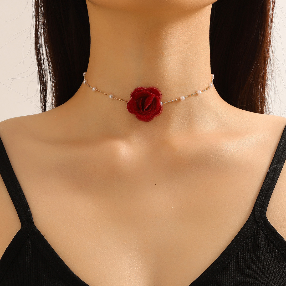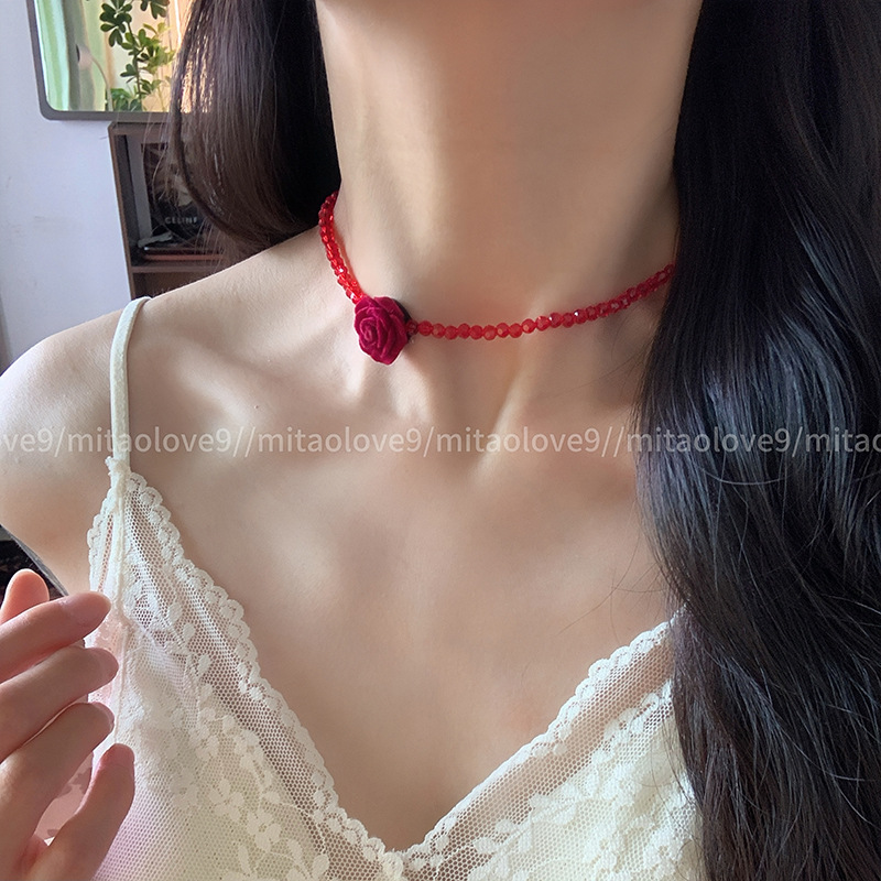 Red Crystal Beaded Rose Choker Neck Strap Necklace Niche Retro Clavicle Chain Necklace for Women 2025 New Style