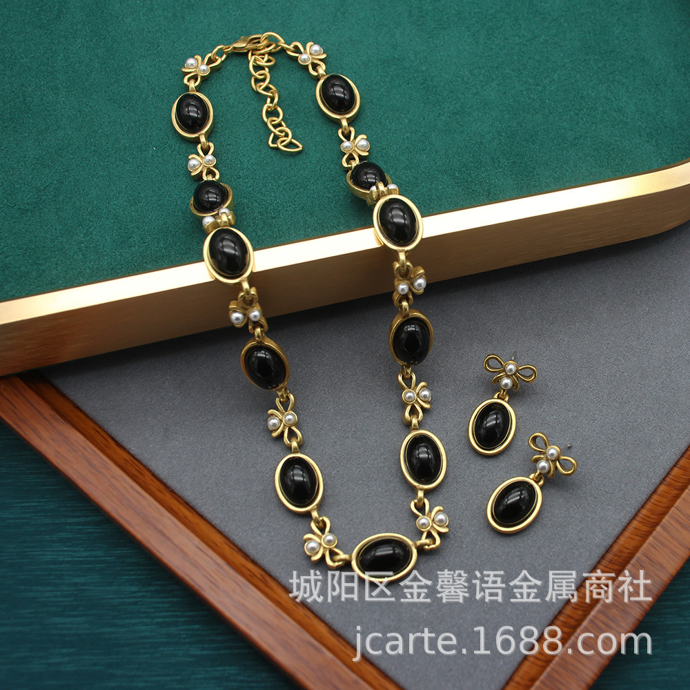 Necklace High-grade Accessories Vintage Old Oval Black Glass Necklace Ear suit Simple Bow Collarbone