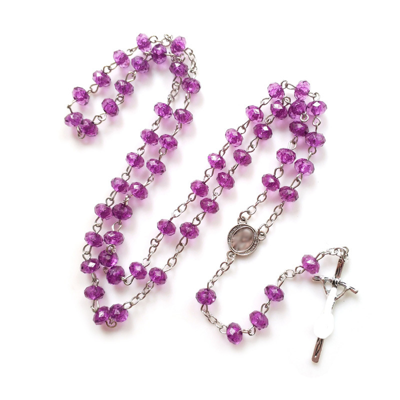 Factory supply purple flat beads rosary necklace sweet beauty long imitation Crystal Cross fashion sweater chain