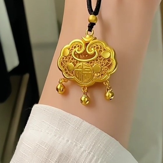 Gold-Plated Jewelry with Hollow "Fu" Character Longevity Lock Necklace, Light Luxury High-End Design, Children's Safety "Fu" Character Gold Lock Bell